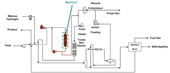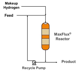 MaxFlux® Advanced Hydrotreating Technology is a novel alternative to traditional hydroprocessing. The hydrotreating reactors operate in a high mass flux mode that removes the mass transfer limitation and eliminates the need for large volumes of hydrogen recycle gas as a quench fluid. Instead, hydrogen is dissolved in a recycle liquid stream to deliver more hydrogen to the reactor and stabilize temperature fluctuations (Figure 1). As a result, installation of MaxFlux instead of conventional hydrotreating offers significant capital cost savings, improved yields, and longer catalyst life.